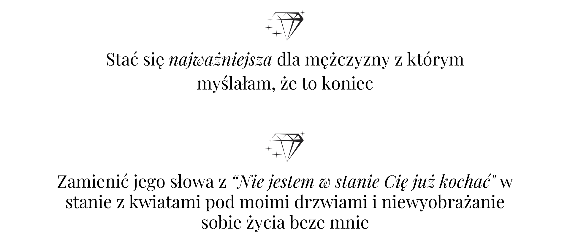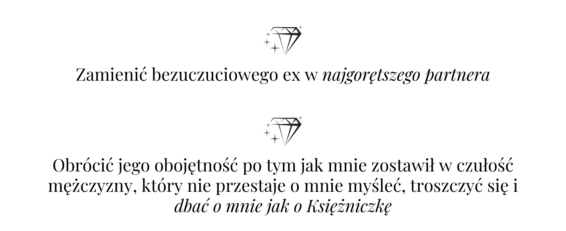 Pokażę Ci, jak całkowicie zmienić energię, z jaką na niego oddziałujesz, odblokowując Twój magnetyzm, żebyś naprawdę zaczęła go przyciągać i już nigdy nie zastanawiała się, czy on wróci, bo sam zacznie Cię pragnąć.