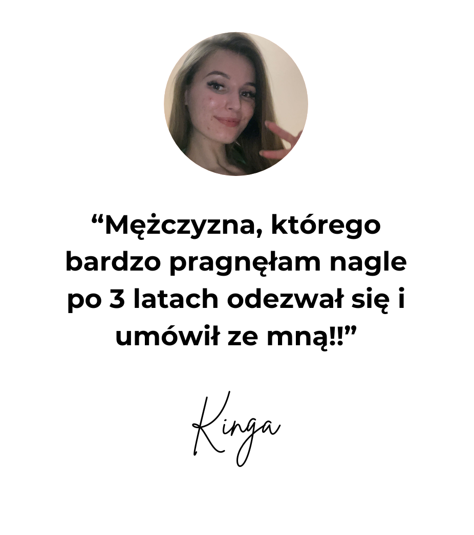 Pomogę Ci zbudować swoją magnetyczną energię, która sprawi, że on nie będzie mógł się oprzeć pociągowi, który zacznie czuć do Ciebie, nawet jeśli nie mieliście kontaktu przez 2 lata, bo — (uwaga, najlepsza część!) — to zjawisko energetyczne działa tak samo silnie niezależnie od okoliczności zewnętrznych (tzw. 3D)!